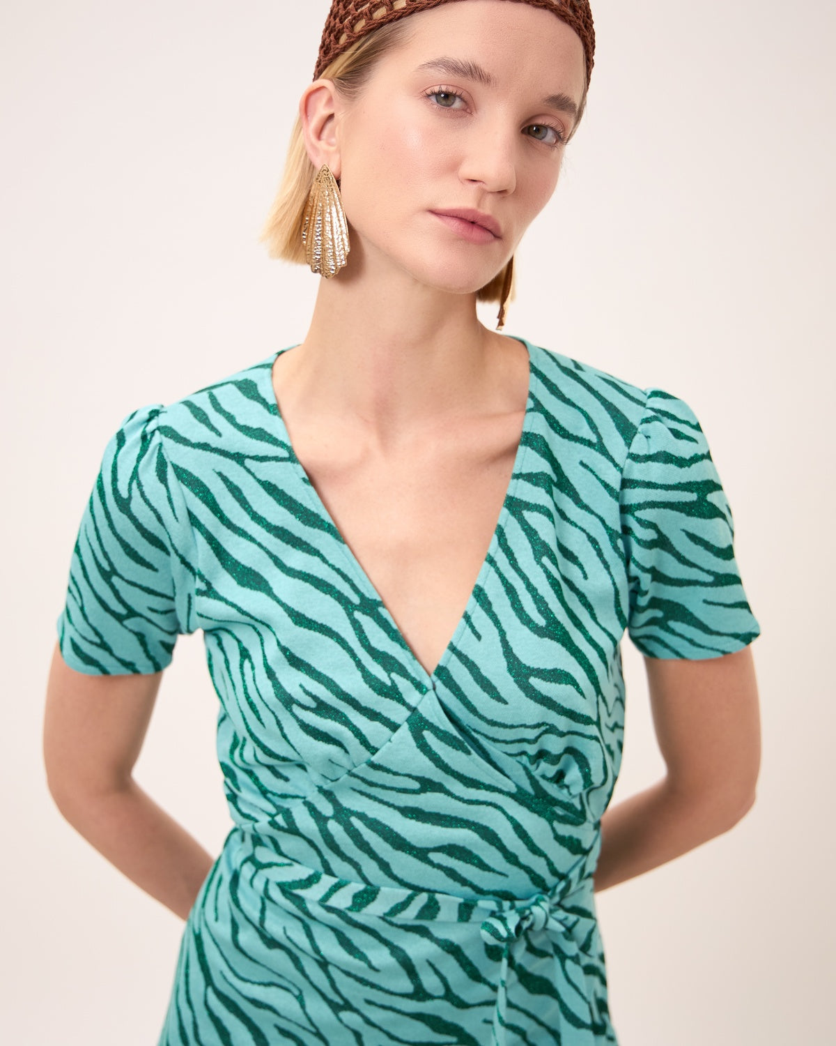 Abito corto dal design femminile e contemporaneo, caratterizzato da una fantasia zebrata che dona carattere e dinamismo al look. Un capo fresco e versatile, perfetto per outfit estivi dallo stile deciso e sofisticato.
