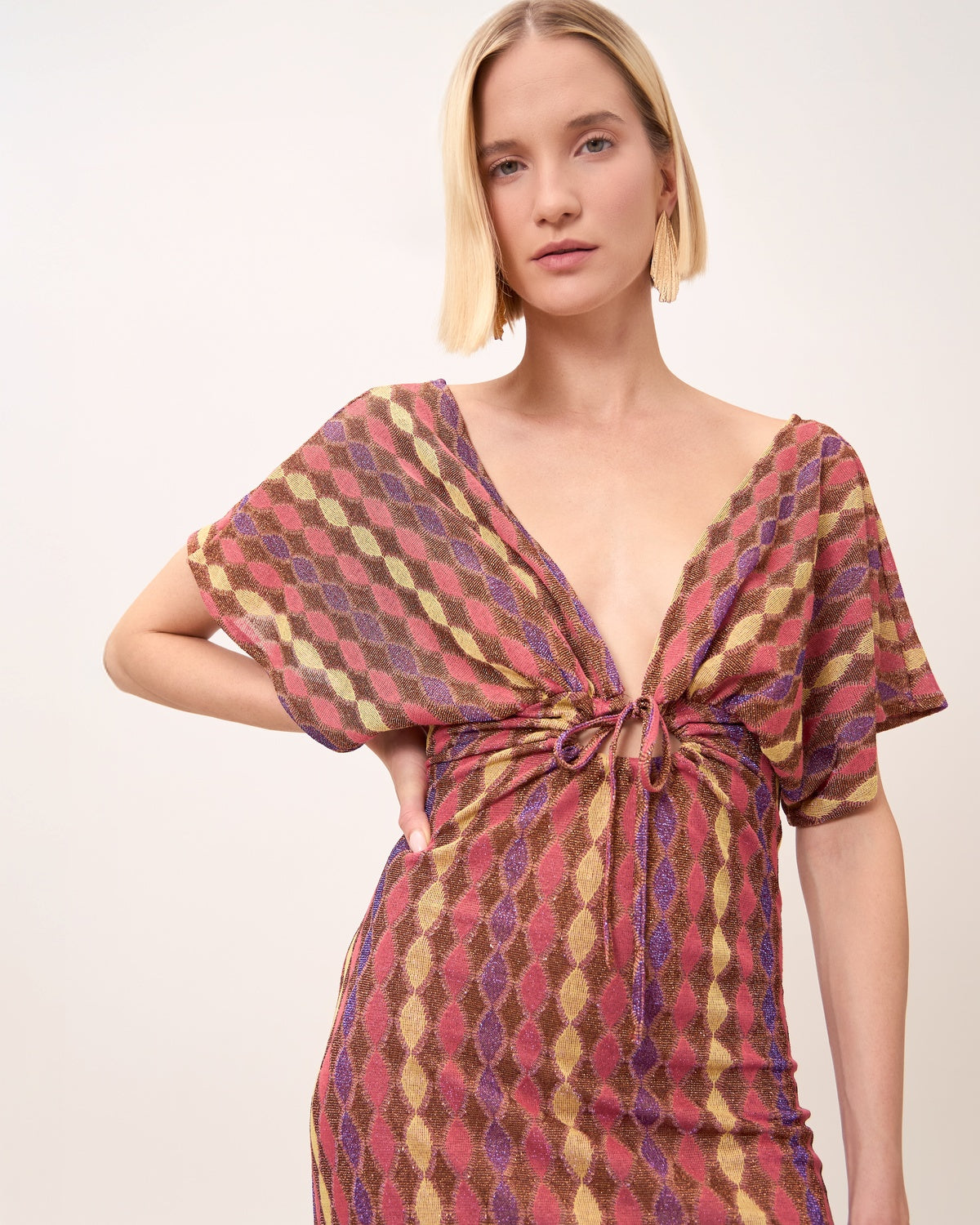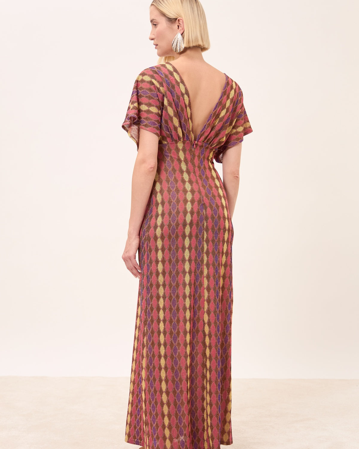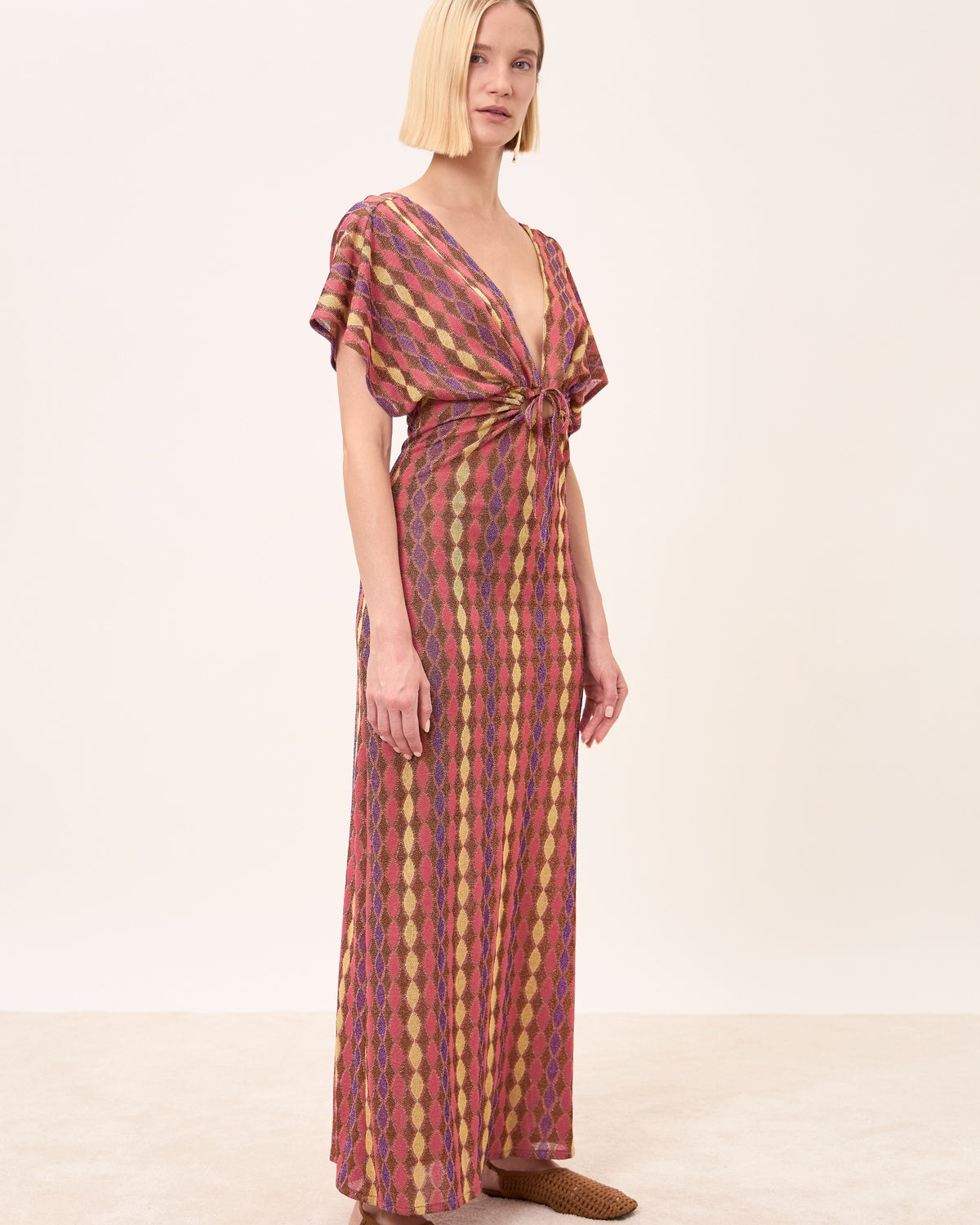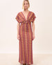 Abito lungo dal design femminile e contemporaneo, valorizzato da una fantasia geometrica multicolor che slancia la figura e dona grande impatto visivo. Lo scollo incrociato e le maniche ampie rendono il capo elegante e fluido, perfetto per occasioni estive ricercate.