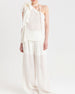 Il design asimmetrico mette in evidenza la spalla con un volume decorativo che diventa il punto focale del capo.