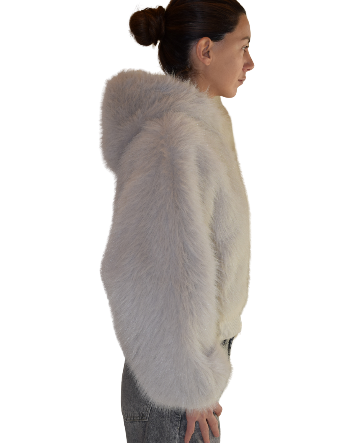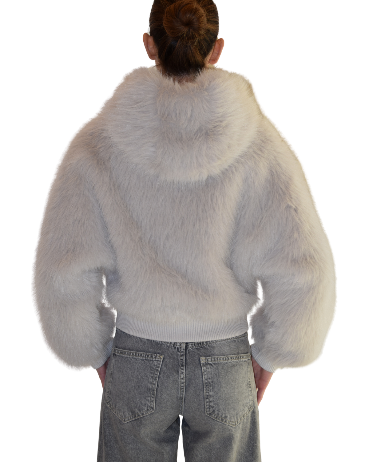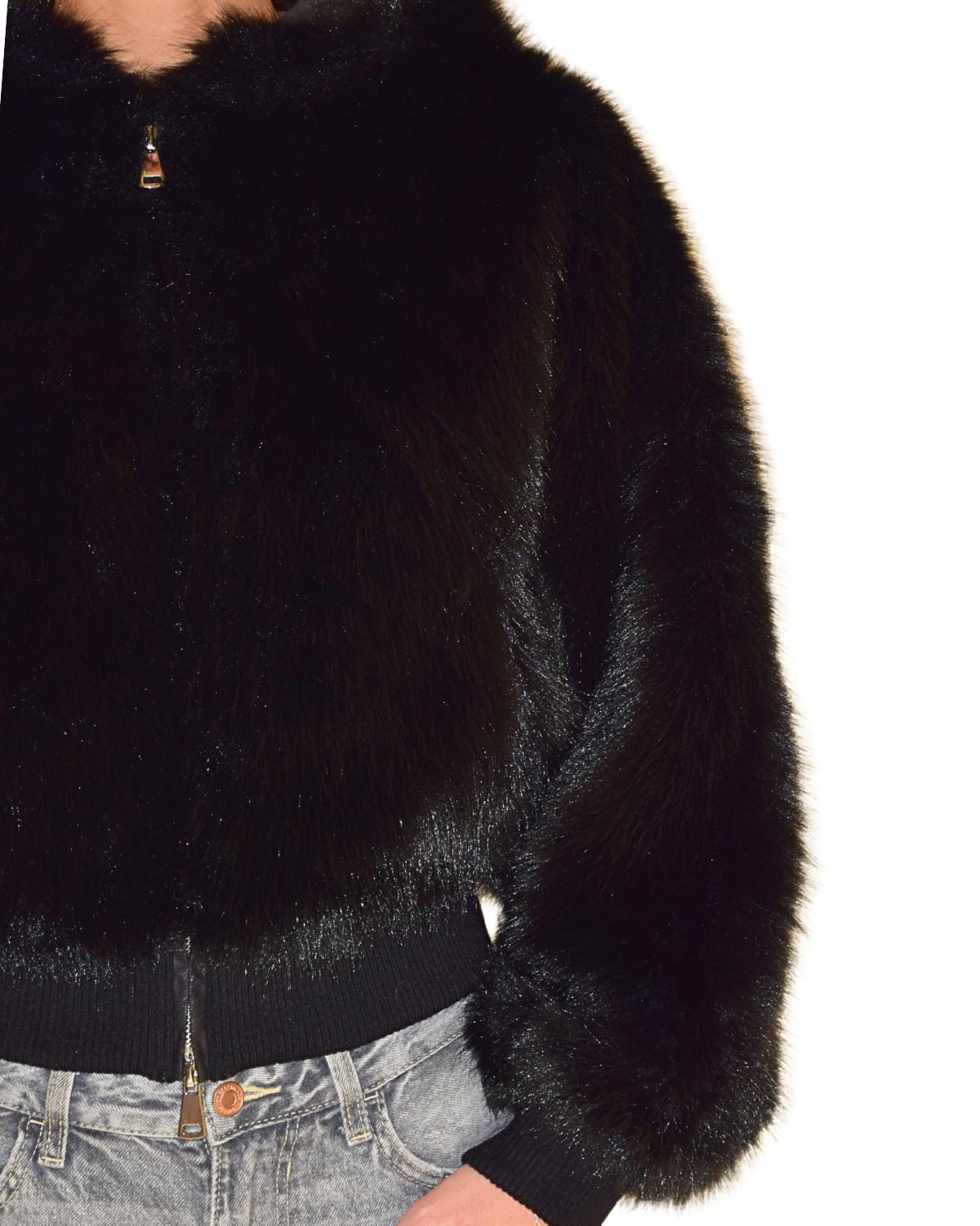 Bomber in morbida eco-pelliccia c caratterizzata da un volume soffice e avvolgente. Il modello presenta cappuccio ampio, chiusura a zip frontale e polsini e fondo in maglia elasticizzata che definiscono la silhouette. Calda e confortevole, aggiunge un tocco glamour anche agli outfit più casual. Perfetta per le giornate fredde grazie alla sua texture soffice e al taglio moderno.