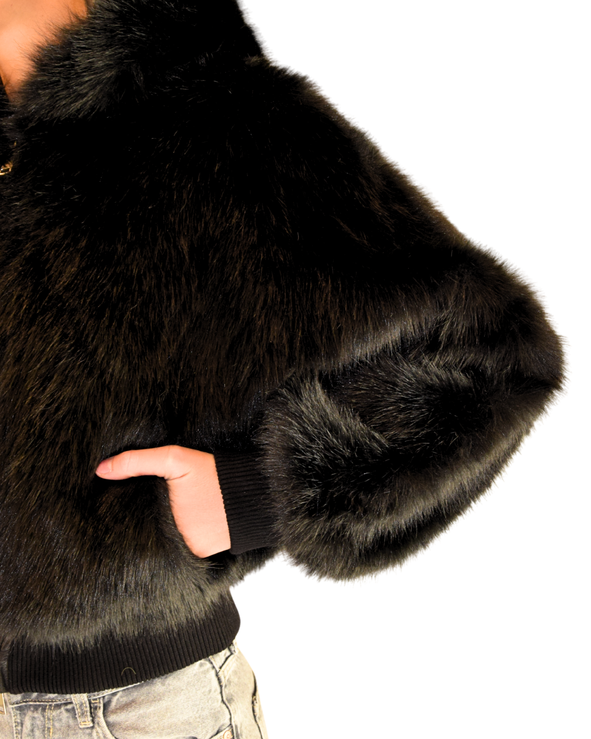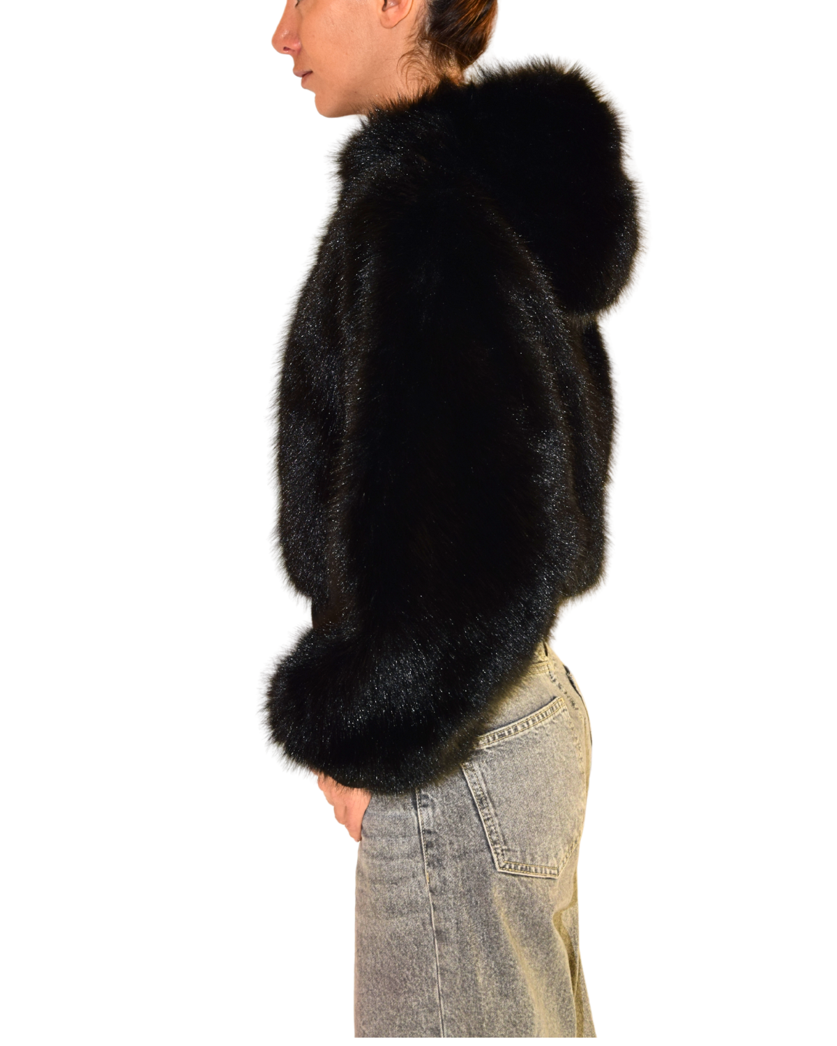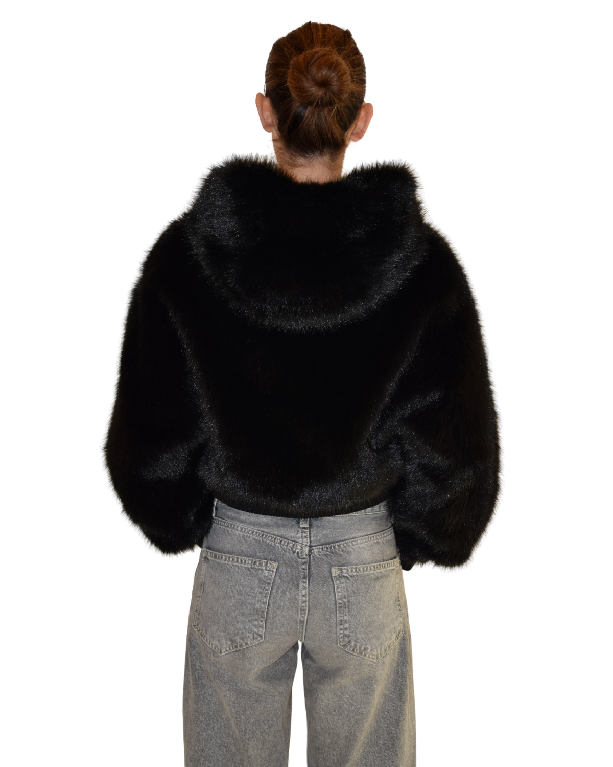 Bomber in morbida eco-pelliccia c caratterizzata da un volume soffice e avvolgente. Il modello presenta cappuccio ampio, chiusura a zip frontale e polsini e fondo in maglia elasticizzata che definiscono la silhouette. Calda e confortevole, aggiunge un tocco glamour anche agli outfit più casual. Perfetta per le giornate fredde grazie alla sua texture soffice e al taglio moderno.
